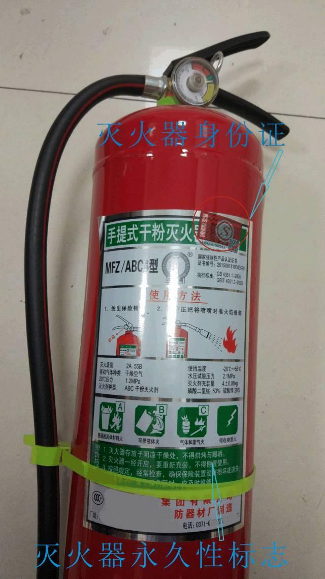 1、幹粉滅火器瓶體法定報(bào)廢年限爲10年:可通過壓力表上出廠日期或瓶體有無身份證判定滅火器瓶體出廠日期(自2008年1月1日起,防火門、滅火器、消防應急燈三類産(chǎn)品全面實行消防産(chǎn)品身份證制度)(如下圖);