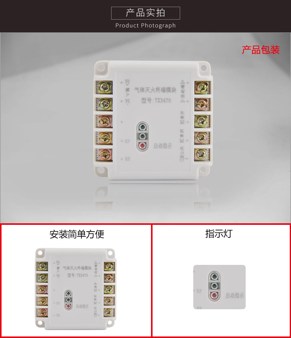 TX3470氣體滅火終端模塊用於在氣體滅火控制裝置系統中控制放氣電磁閥,完成滅火氣體噴灑。