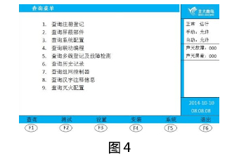 ① 按“功能”鍵,進入選項菜單,按“F1 查詢”鍵,輸入二級密碼,按“確認”鍵,進入查詢菜單界面(圖4)。